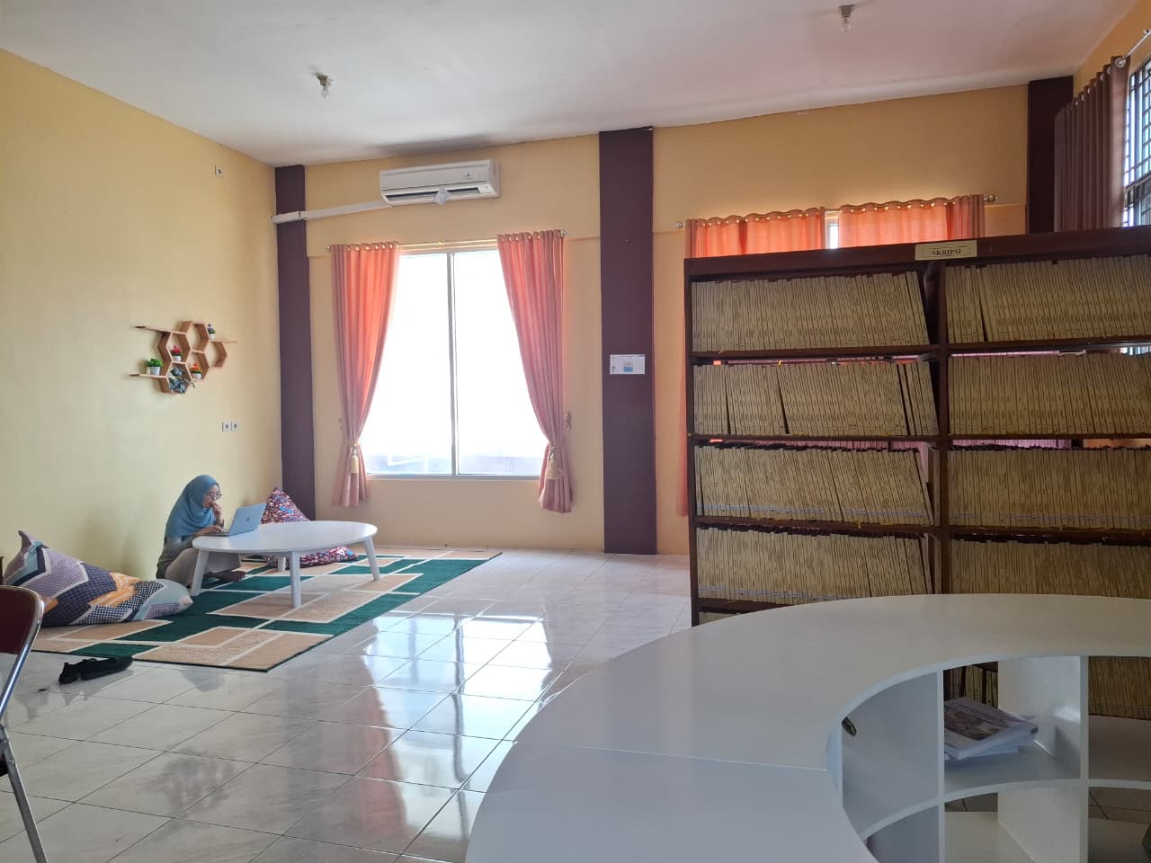 Ruang baca lesehan ini tersedia di dua lokasi, yaitu di lantai 1 dan lantai 2 perpustakaan. Dilengkapi dengan meja rendah, alas duduk, serta bantal santai, area ini memungkinkan mahasiswa untuk membaca, berdiskusi, maupun mengerjakan tugas secara kelompok dengan lebih leluasa. Penataan ruang yang rapi dan suasana yang kondusif juga menjadi nilai tambah dalam menunjang kegiatan akademik di lingkungan perpustakaan.